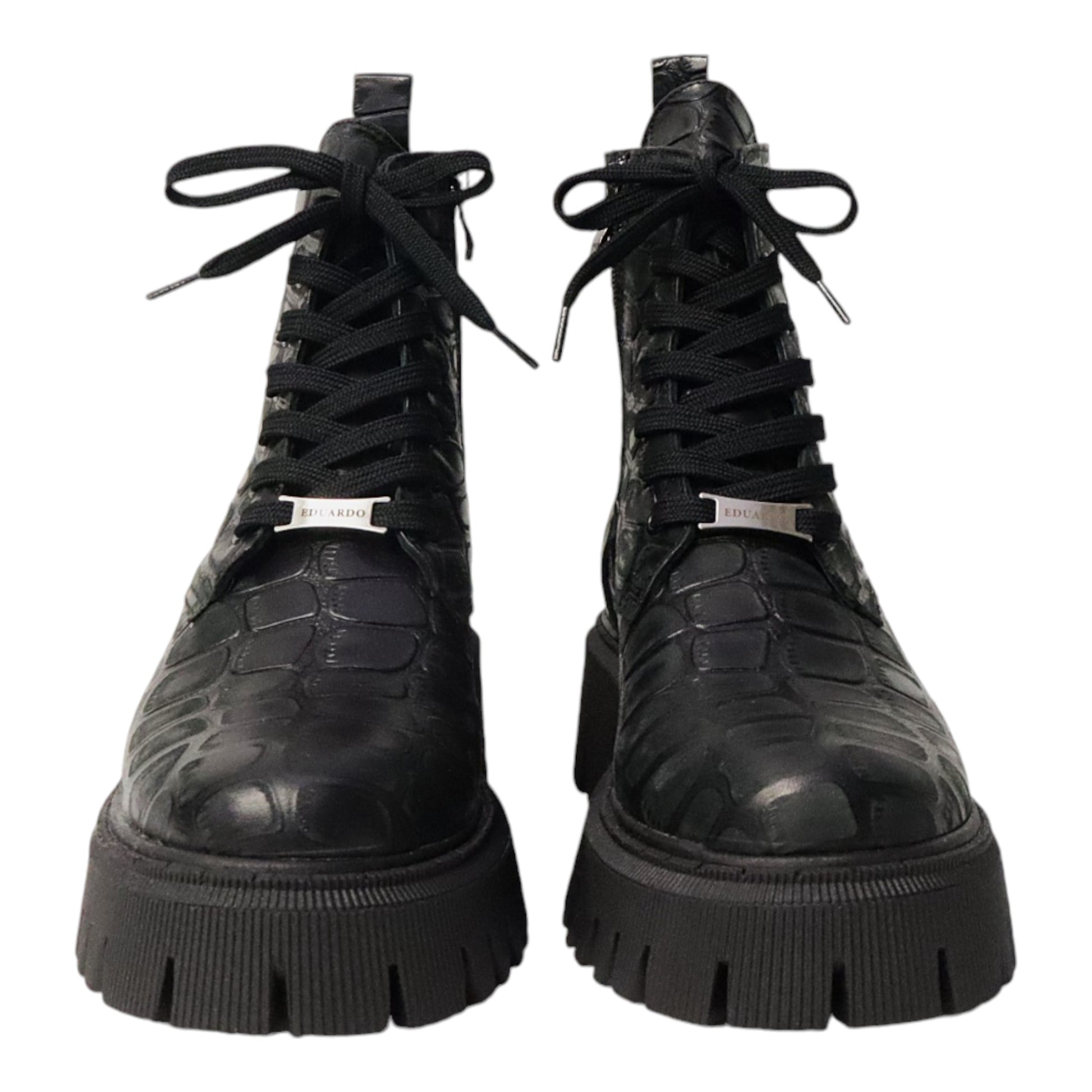 Ontdek het dames laarsje met croco patroon van het Nederlandse merk Eduardo, gemaakt van hoogwaardig zwart leer uit Italië. Deze stijlvolle laarsjes combineren een robuuste uitstraling met luxe comfort. De dikke zool geeft de laars een stoere look, terwijl de rits aan de zijkant het aan- en uittrekken vergemakkelijkt. Of je nu op zoek bent naar een elegante toevoeging aan je herfstgarderobe of een praktische keuze voor dagelijks gebruik, deze laarsjes bieden het beste van beide werelden.