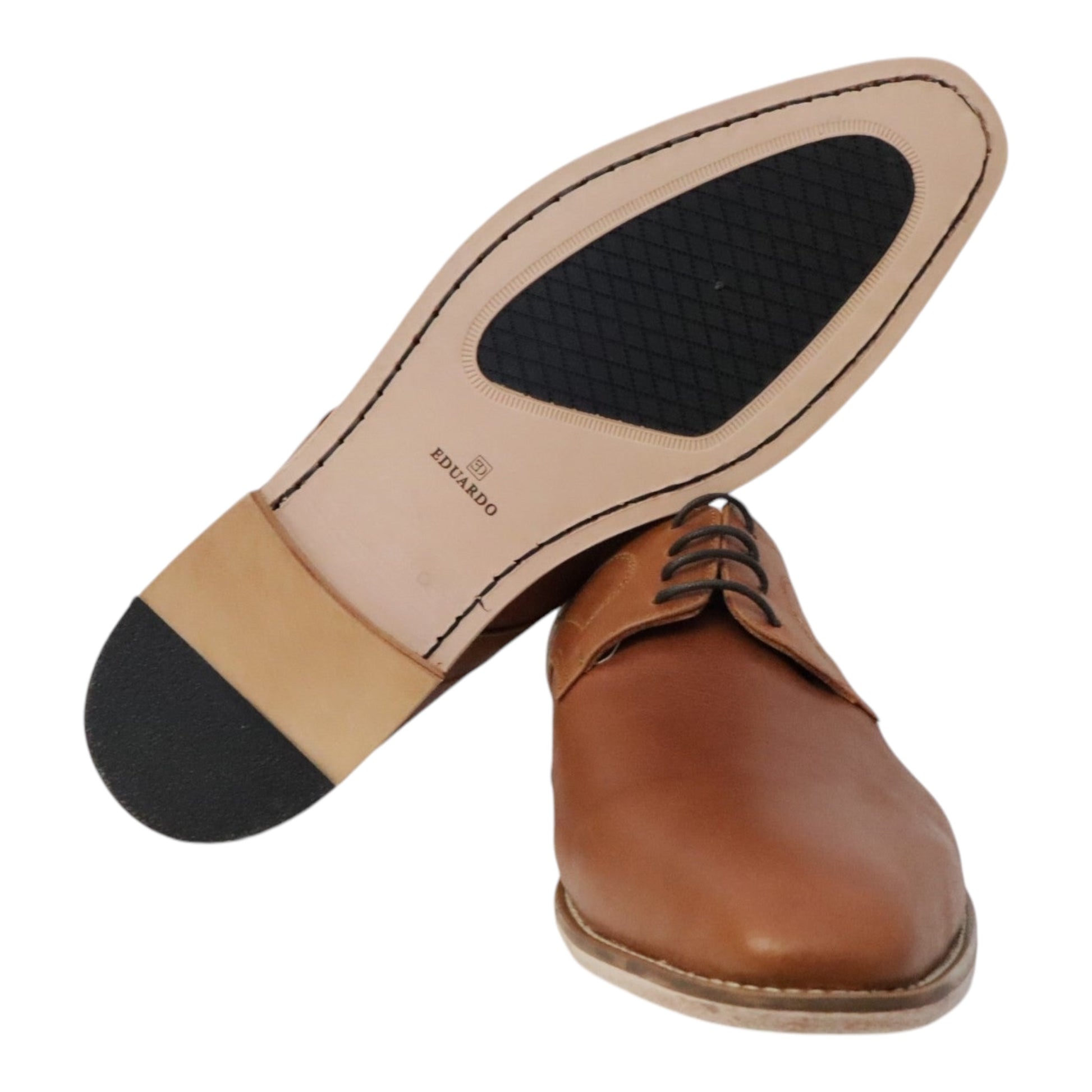 Lage licht bruine nette  veterschoen voor heren van het Nederlandse merk Eduardo. Deze veterschoen is vervaardigd uit bruine kwaliteit leer. De binnen voering en het voetbed zijn van leer dat draagt bij aan het loopcomfort. De zool is van hoogwaardige leer.