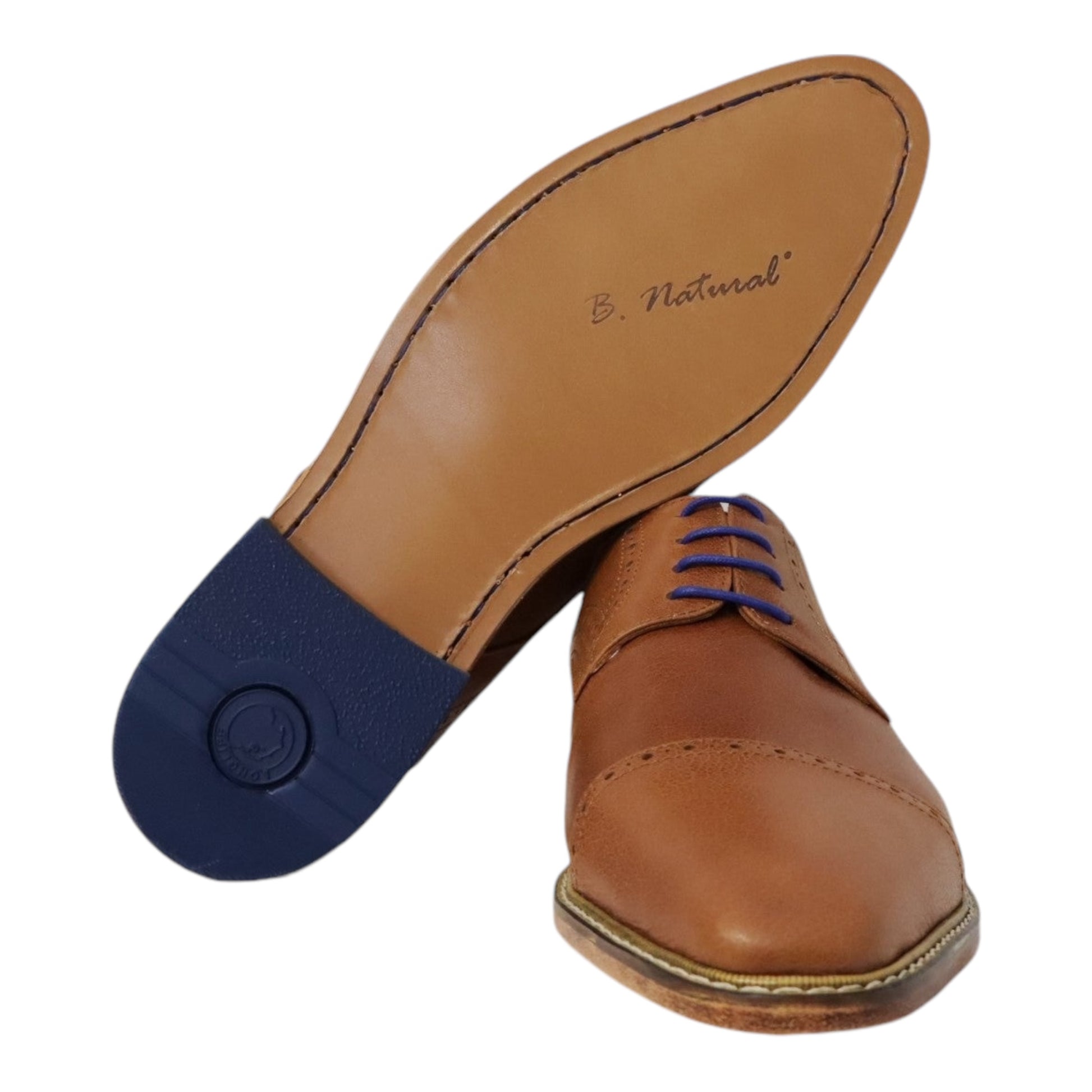 Lage bruine nette herenschoen met blauwe veters en stikwerk. Gemaakt van hoge kwaliteit leer.