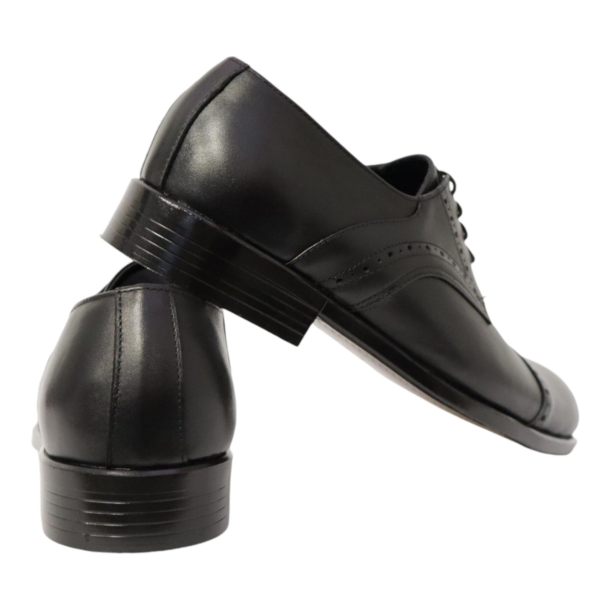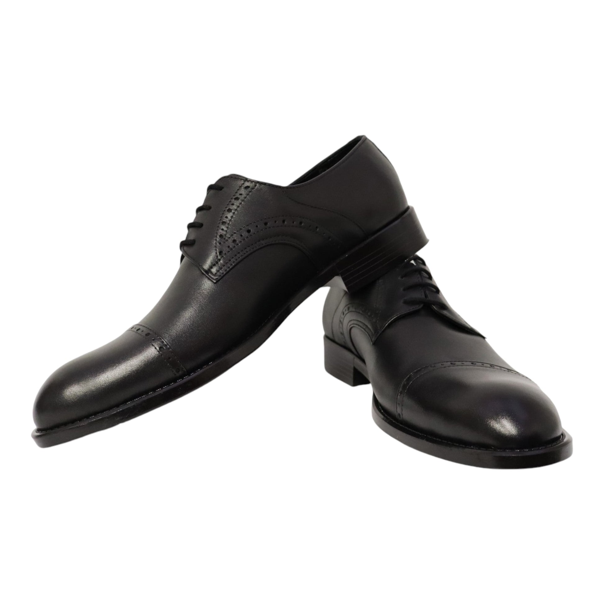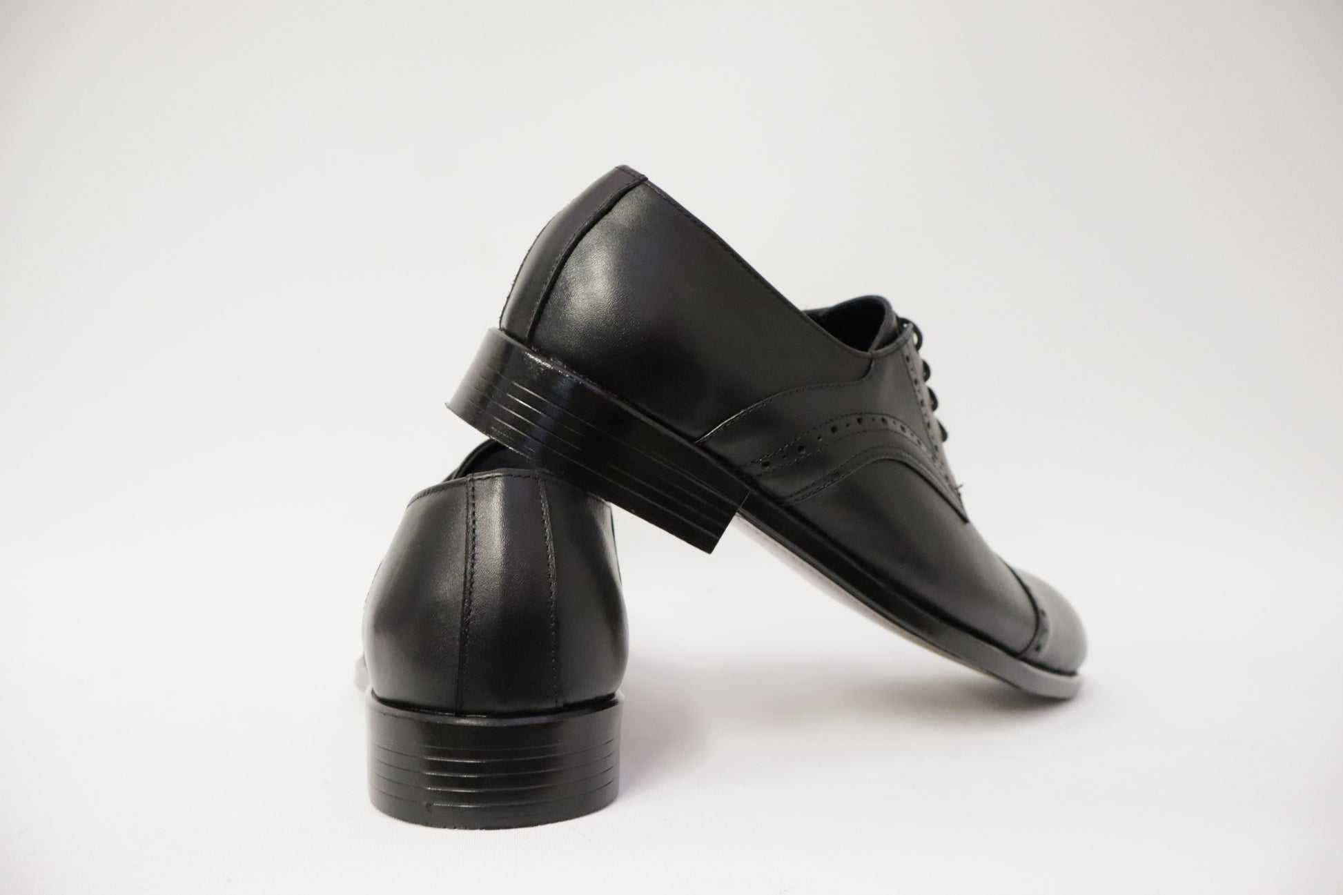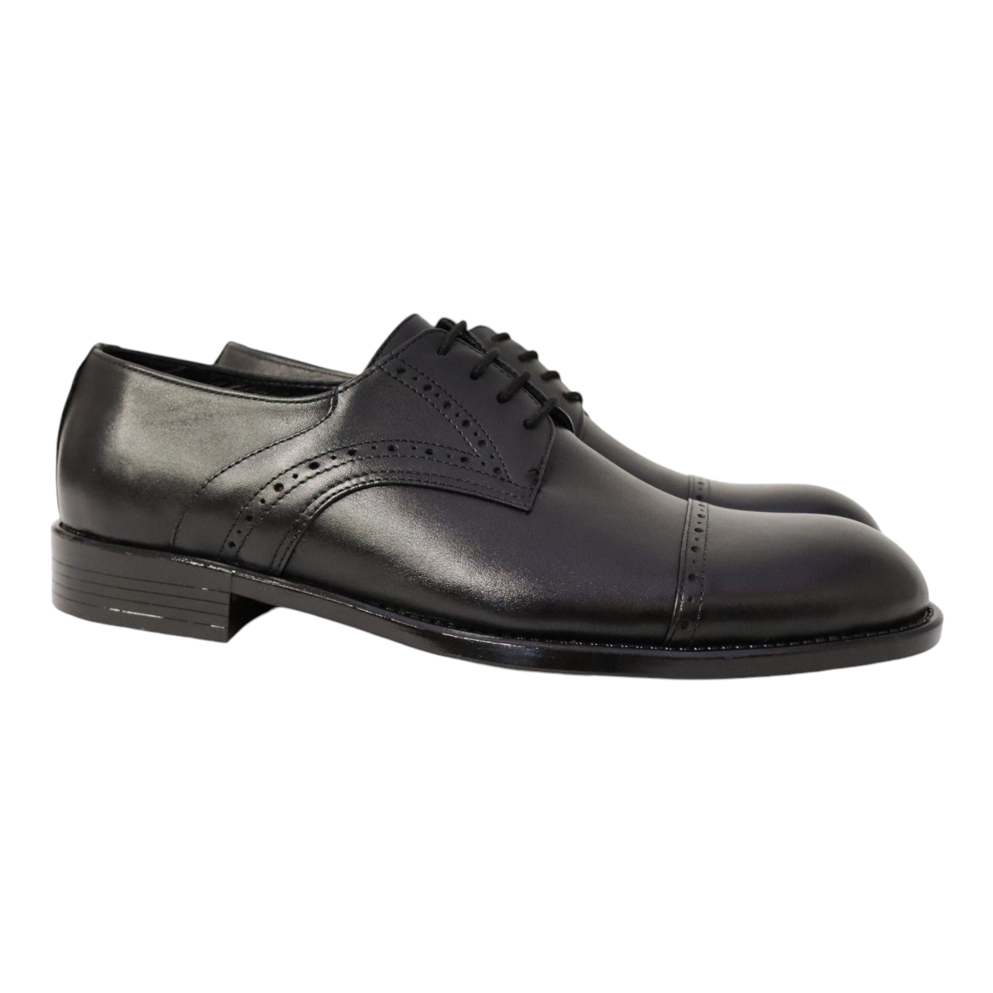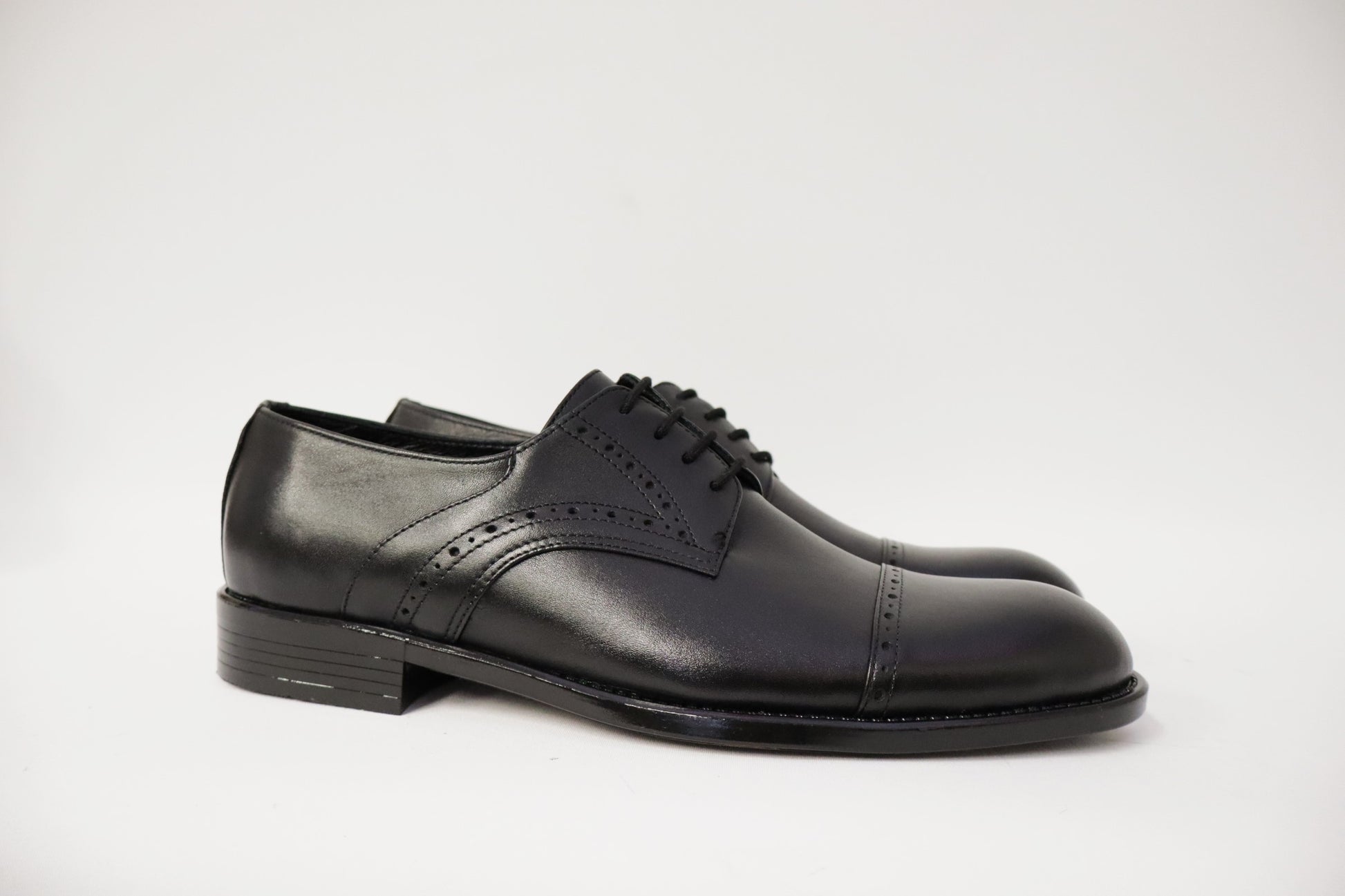 Lage zwarte nette herenschoenen met zwarte veters en stikwerk. Gemaakt van hoge kwaliteit leer.