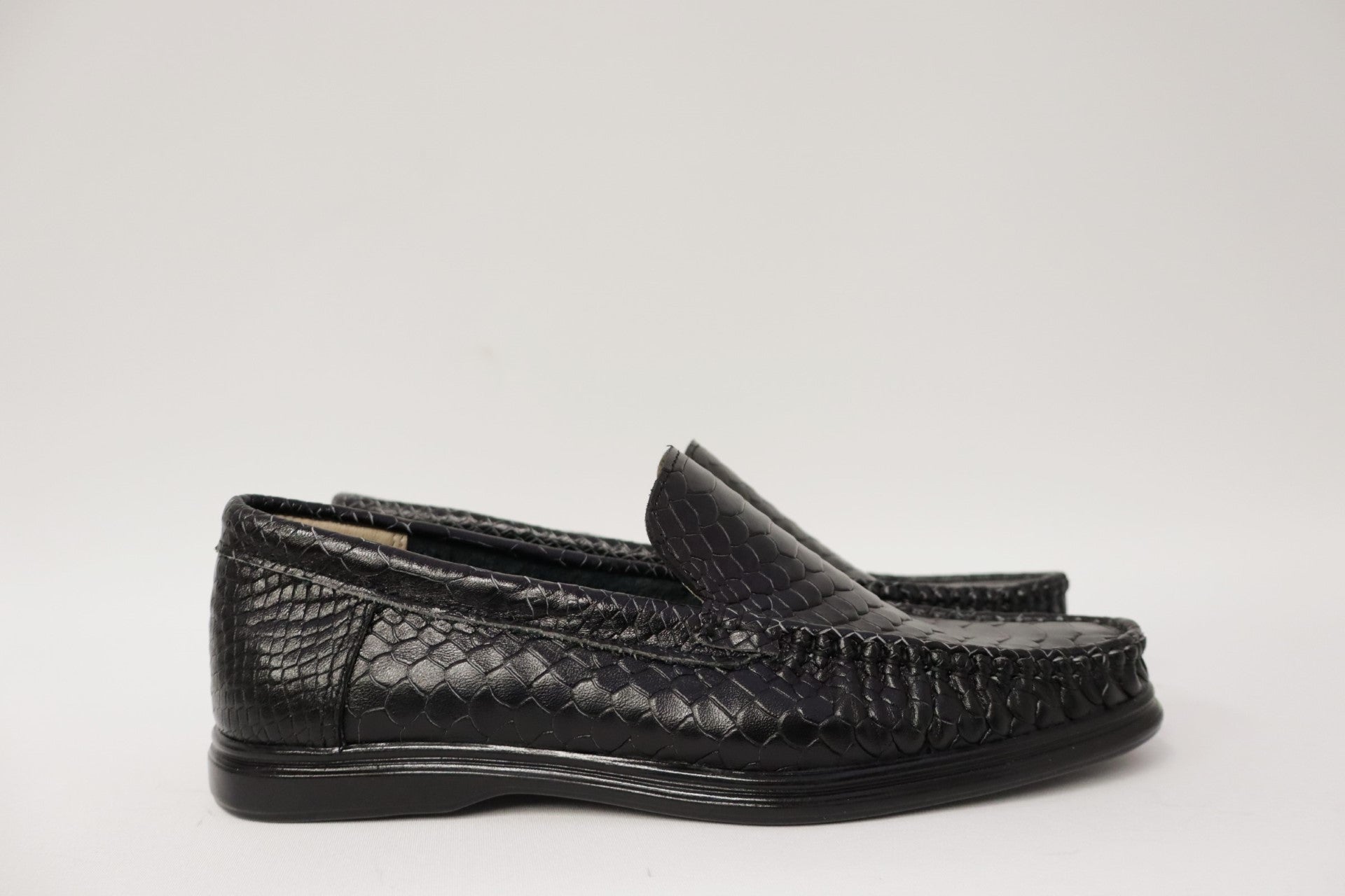 Lage zwarte nette loafer voor heren. Gemaakt van hoge kwaliteit slangenleer met uniek patroon.