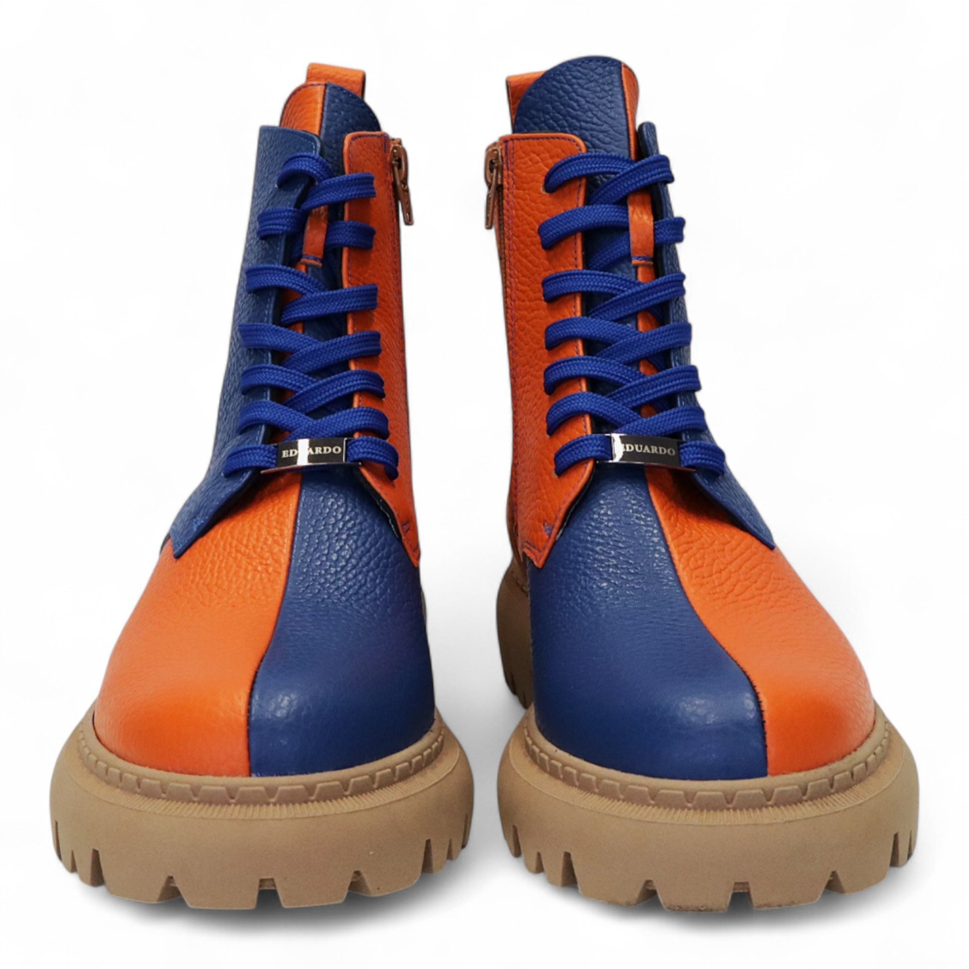 Oranje/Blauw dames laarsjes van het Nederlandse merk Eduardo. Deze laarsjes zijn vervaardigd uit kwaliteit leer. De binnen voering en het voetbed zijn van leer dat draagt bij aan het loopcomfort. De zool is van rubber voor een goede grip op verschillende loop oppervlakken.